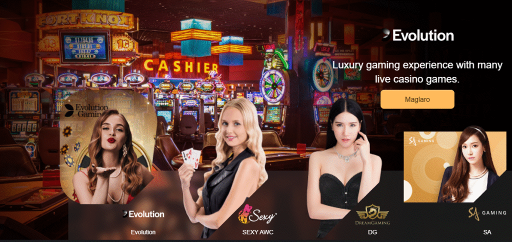 Powered by Evolution Gaming, Pragmatic Play Live, and Asia Gaming, the live tables feature professional dealers, HD streaming, and real-time chat.